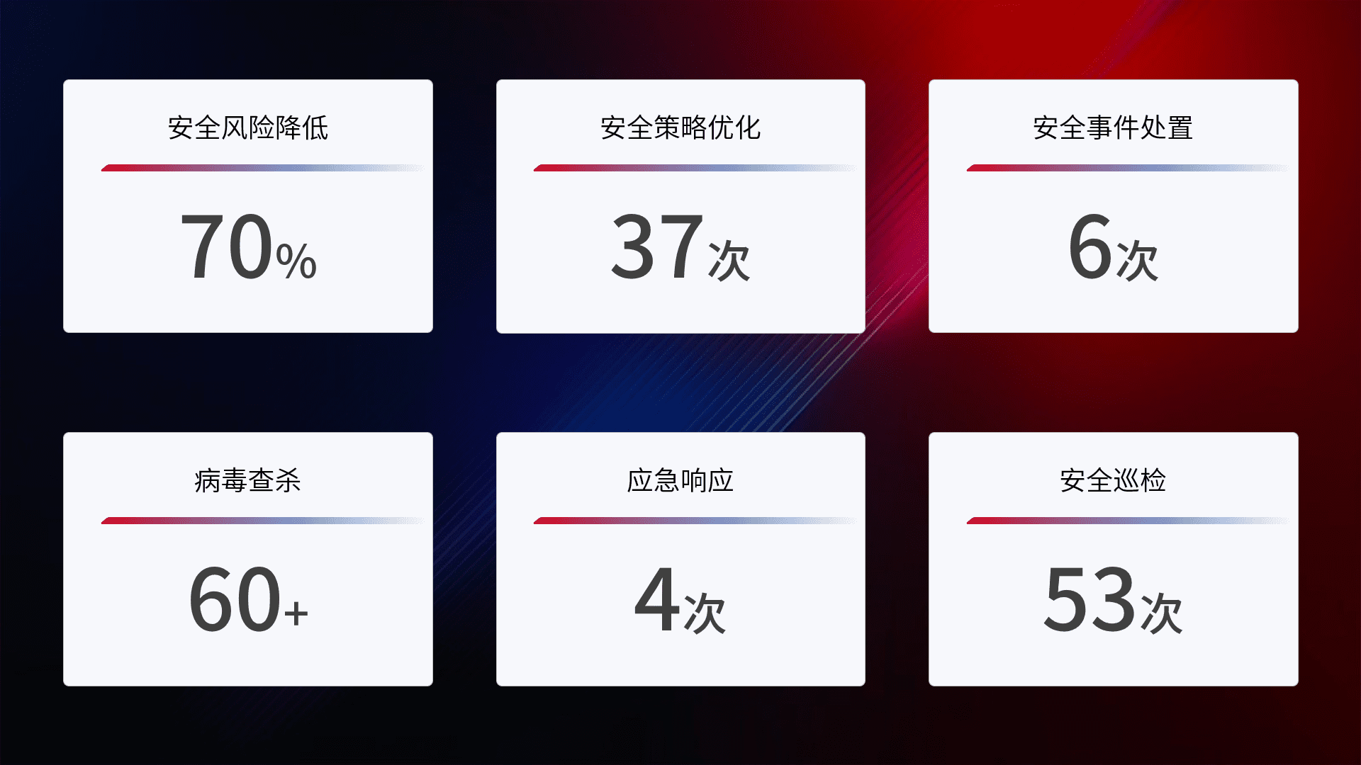 提供全面的安全事件报告体系,,包括处置报告、、、、周报、、、、季度和年度总结,,结合持续监控,,帮助客户深入了解网络安全状况。。。。